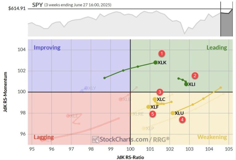 The weekly Relative Rotation Graph (RRG) paints a clear picture of Technology’s strength as it powers further into the leading quadrant. Industrials is still in the lead, but has started to lose some relative momentum — though it’s maintaining the highest RS-ratio reading. Communication Services is showing a clear upward rotation, while Financials and Utilities are inside the weakening quadrant with negative headings (but still above the 100 level, keeping them in the top five).
